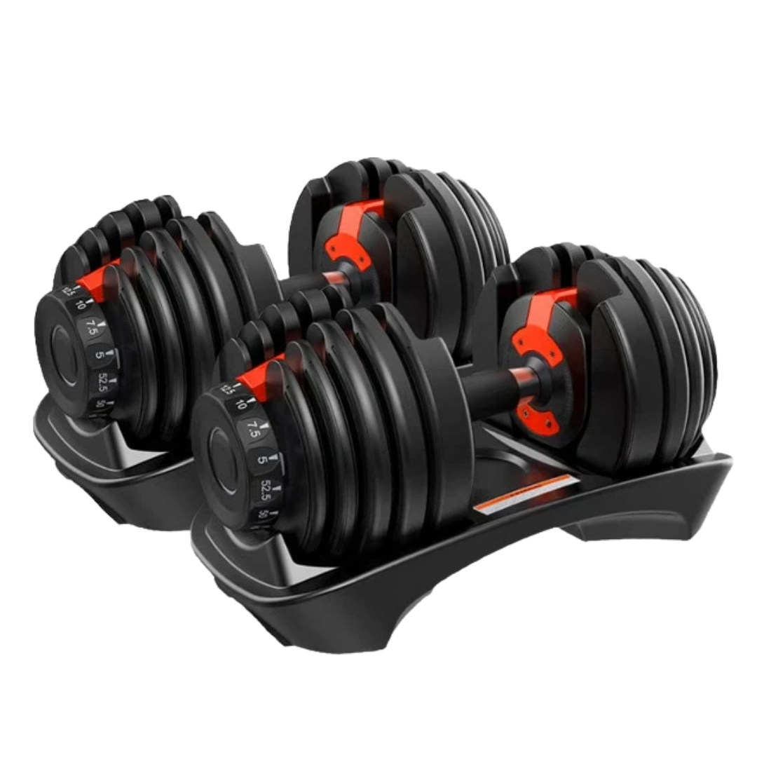 These adjustable dumbbells replace 15 sets of weights! Super efficient, especially for those who lack space in their homes to store multiple weights. Weights adjust from 5 to 52.5 lbs in 2.5 lb increments up to the first 25 lbs. They have an easy-to-use selection dial enabling you to gradually increase resistance for your legs, back, chest, abs, shoulders and arms workouts.